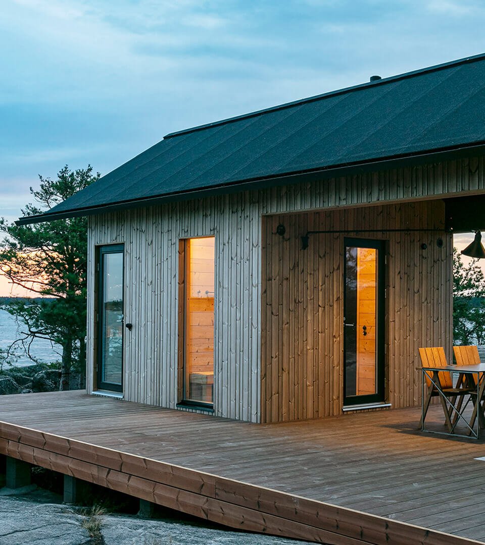 Termo medienos fasado apdaila. Medis nedengtas jokiomis papildomomis priemonėmis, atspalvis natūralaus terminto medžio. Tai yra ilgaamžis ir tvarus pasirinkimas. Termo mediena nesikraipo, nepūna, ilgai išlieka kokybiška. Laikui bėgant natūraliai pilkėja ir nupilkėjusi išlieka tokio atspalvio ilgam.