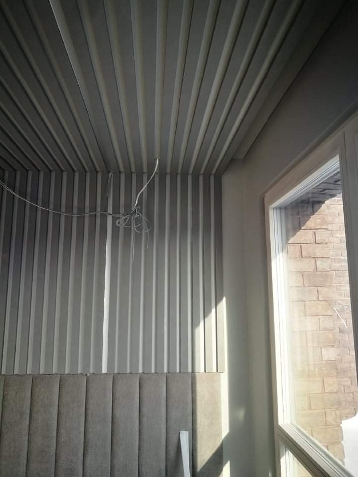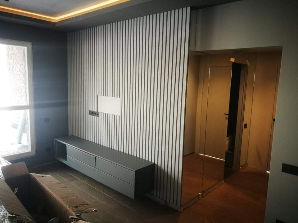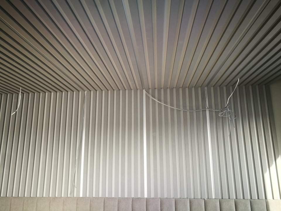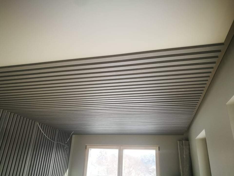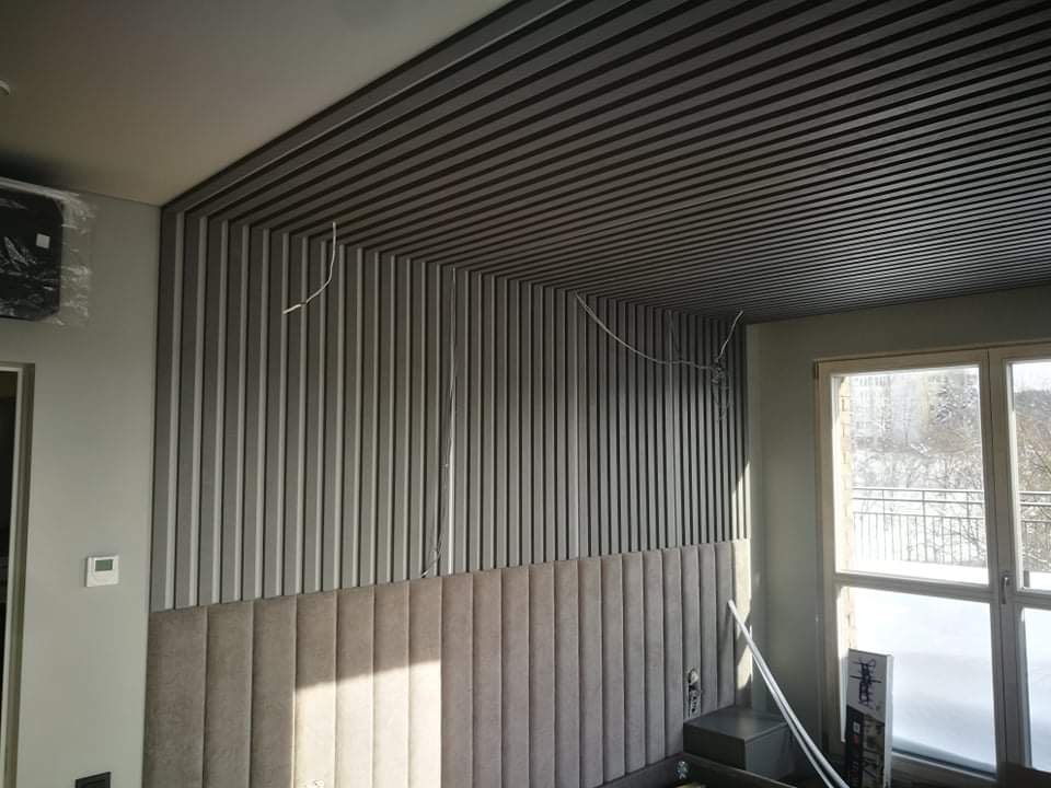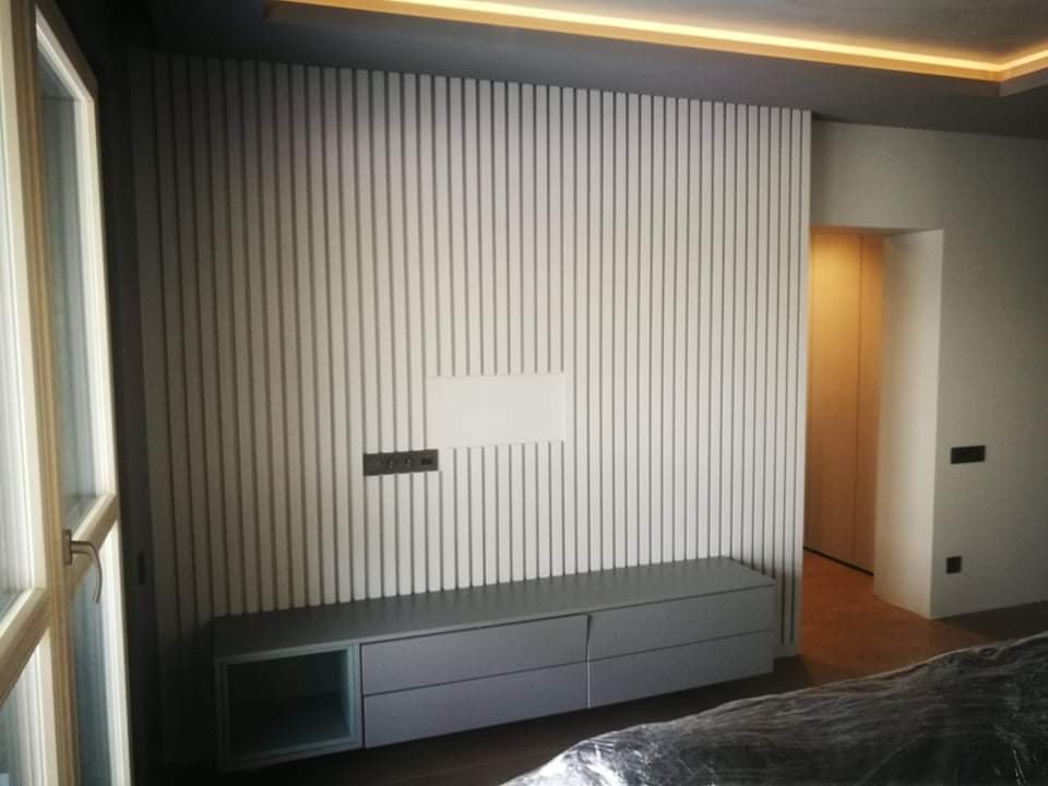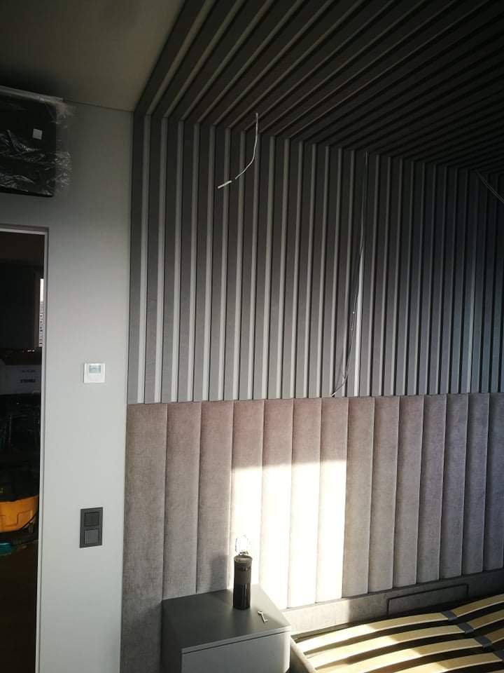Atliepiant visų namų interjerą miegamojo zonoje pasirinkti pilki tašeliai ant baltos sienos su integruotu LED apšvietimu. Pilkos spalvos medžio tašeliai sukuria puikų duetą kartu su audiniu aptrauktomis lovos galvūgalio plokštėmis. Išlaikant vientisumą - sienos tašeliais dengiamos ir lubos. Tokiu būdu lovos erdvė įrėminama. Tokia miegamojo erdvė puikiai tinka poilsiui ir atrodo stilingai.