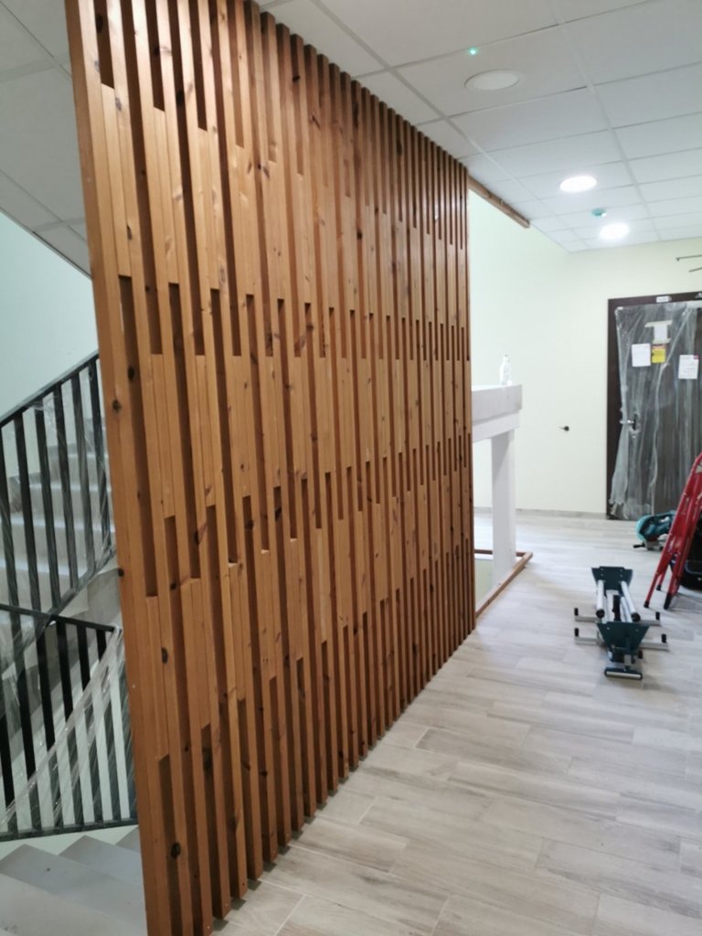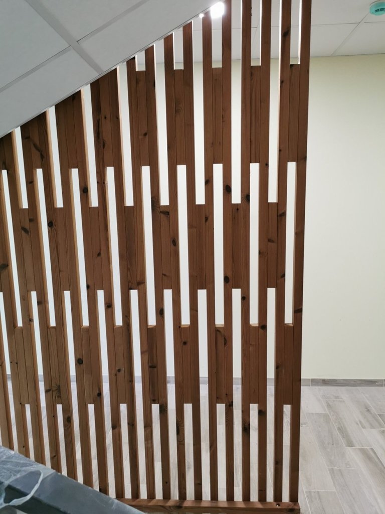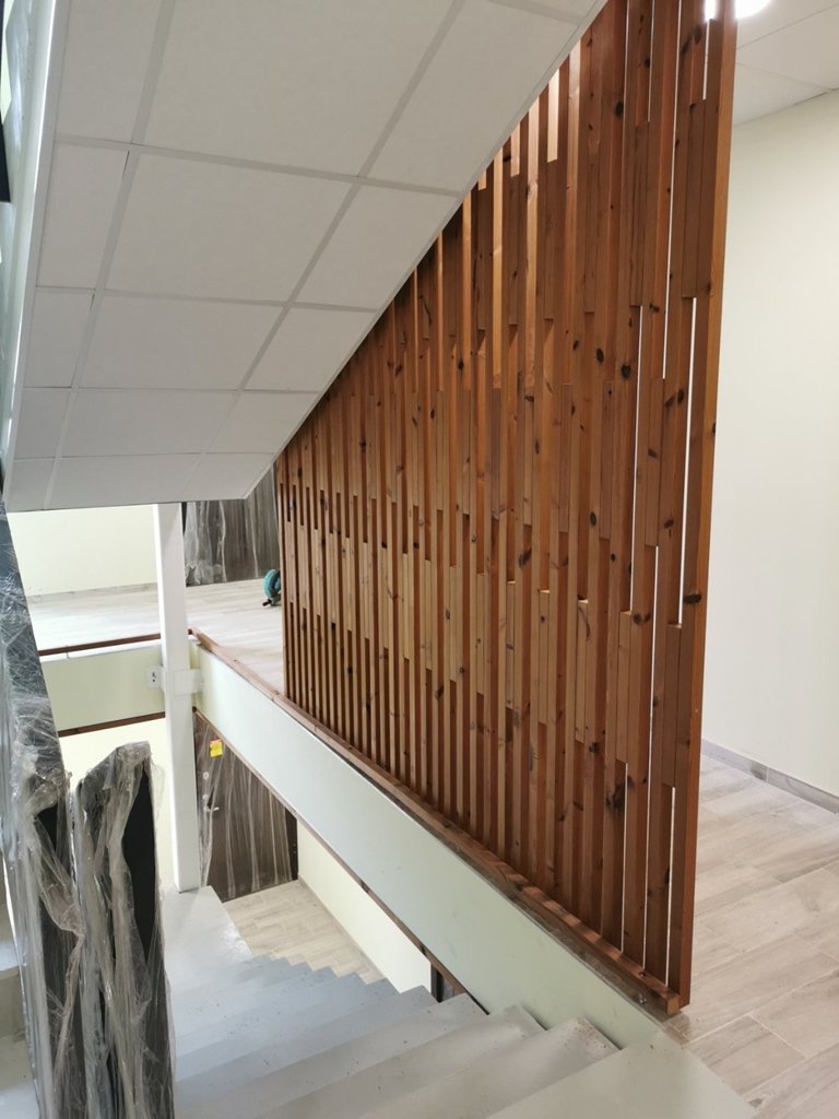 Natūralių medžiagų apdaila vis dažniau naudojama ir bendro naudojimo patalpose, tokiose kaip daugiabučių laiptinės ir pan. Toki tipo elementai sukuria prabangos, kokybės ir jaukumo pojūtį. Nekilnojamas turtas tampa labiau vertinamas, kyla jo vertė rinkoje bei gyventojų pasitenkinimas. Šiame daugiabutyje buvo pasirinktas origanalaus rašto medinis elementas.