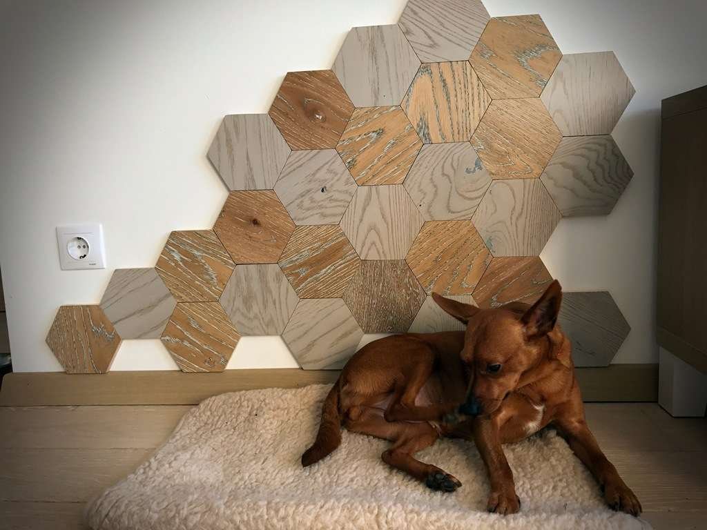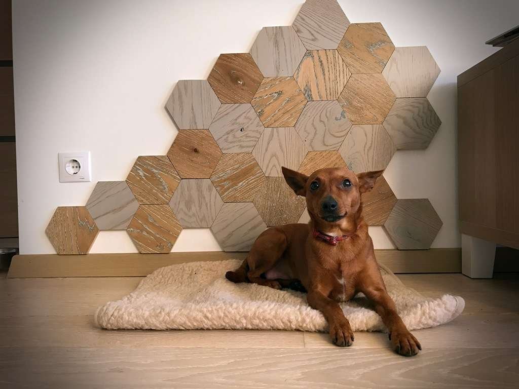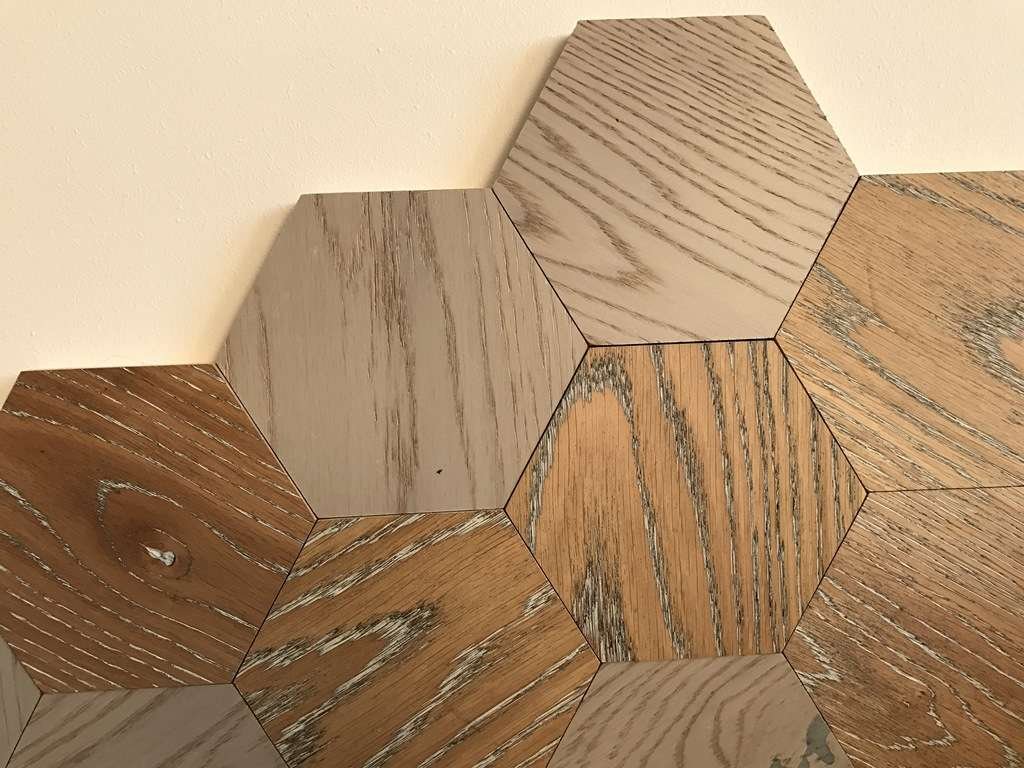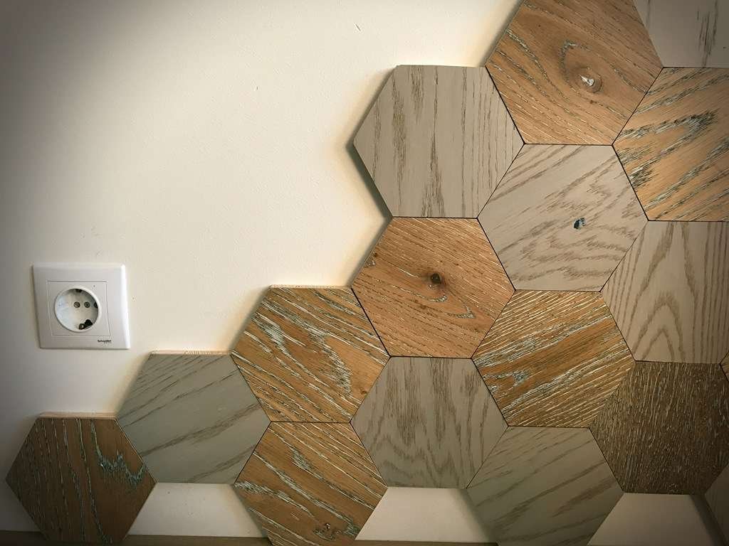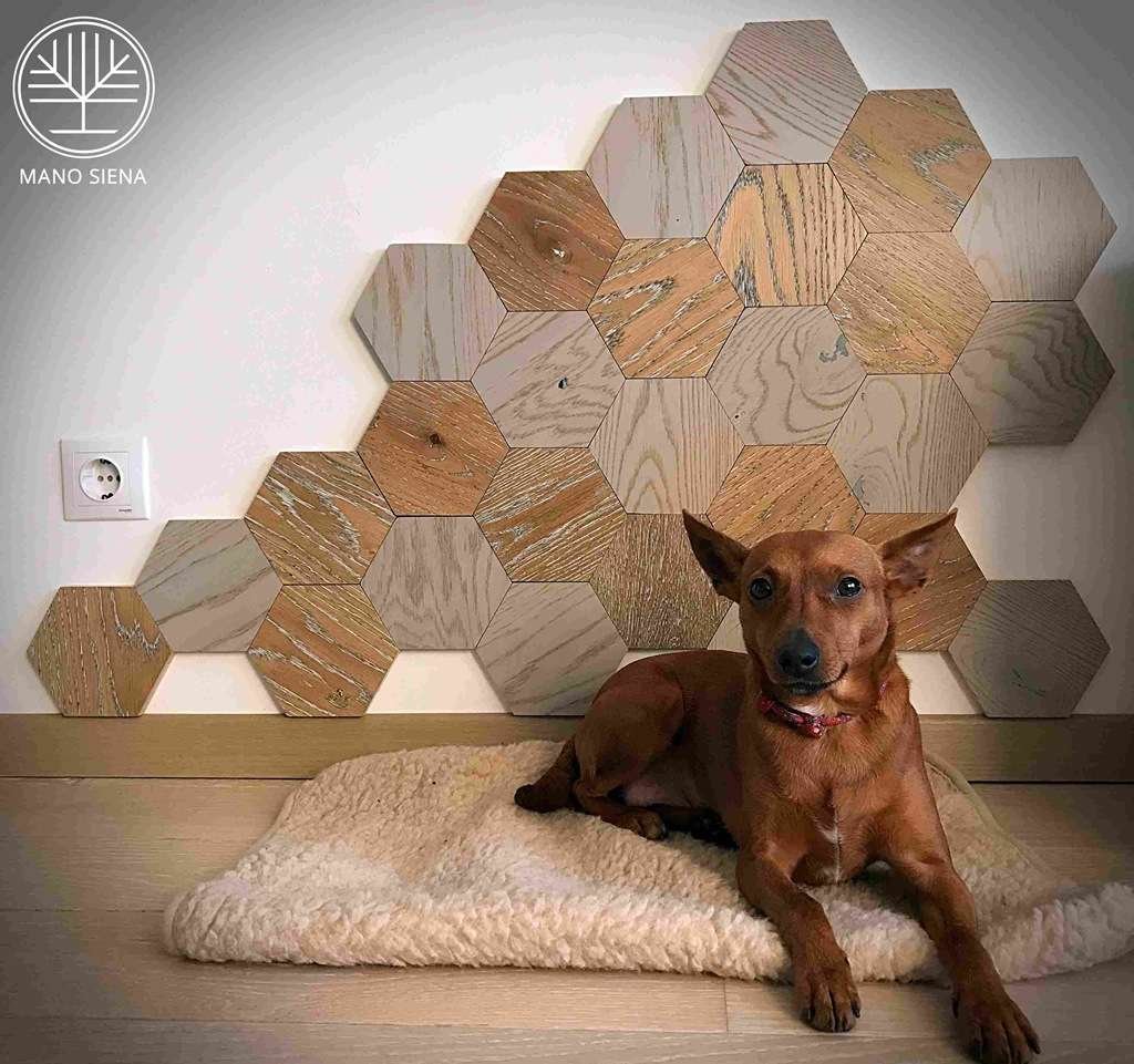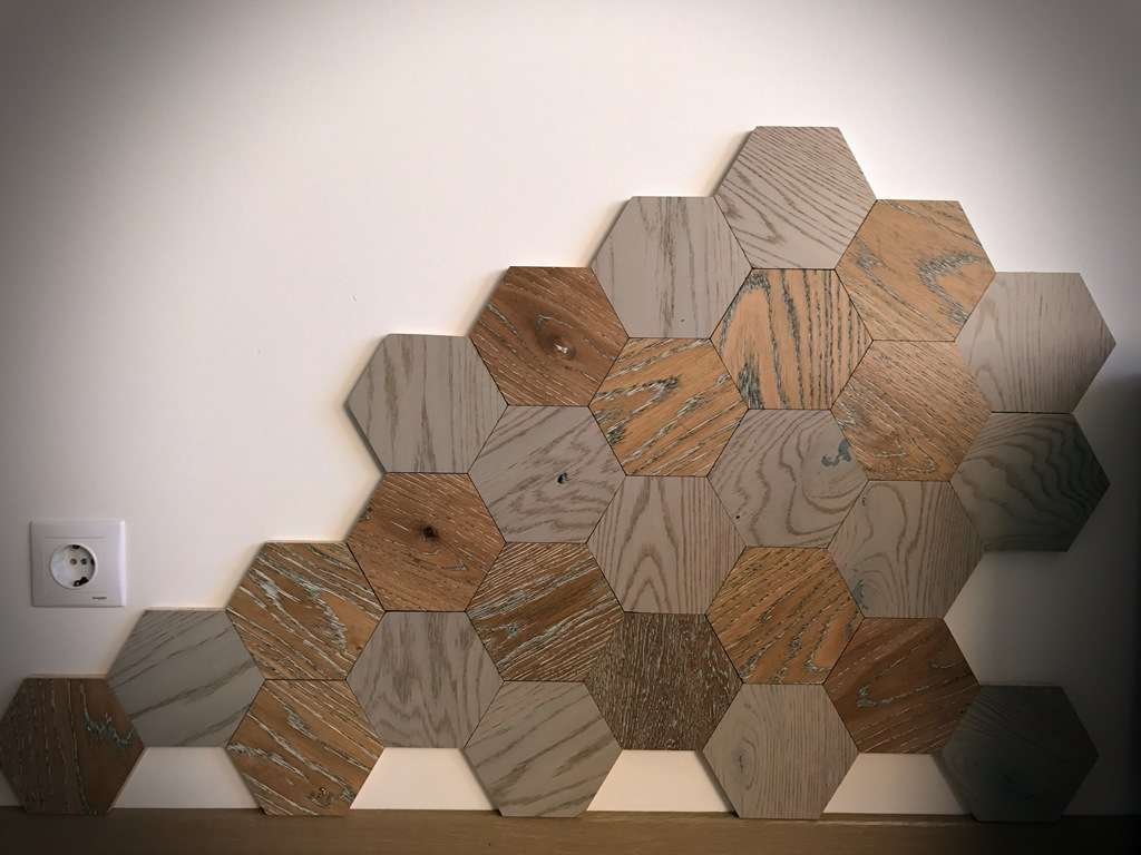 Mediniai šešiakampiai, kuriais galima dekoruoti/ atskirti įvairias skirtingas erdves ir zonas. Juos galime gaminti įvairių skirtingų tekstūrų ir atspalvių. Taip ir jų dydis gali būti labai skirtingas nuo visiškai nedidelių kaip šiame pavyzdyje iki labai plataus sersmens apie 60cm. Tai produktas, kurį klientas pats gali susimontuoti ir nedideliu prisilietimu atnaujinti erdvę ar sieną.