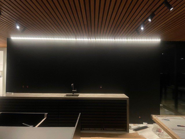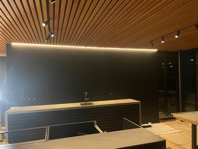 Medinės tašelių lubos. Objektas Norvegijoje. Šiame projekte pasiūlymėme savo individualiai gaminamą produktą, tašelių lubų apdailą su individualiu atspalviu. Papildomai šiam klientui pagaminome ir jų norimą dydį, kuris pritaikytas pagal šviestuvus, kad jie organiškai tilptų į numatytus tarpus ir visa medžiaga būtų panaudota efektyviai.